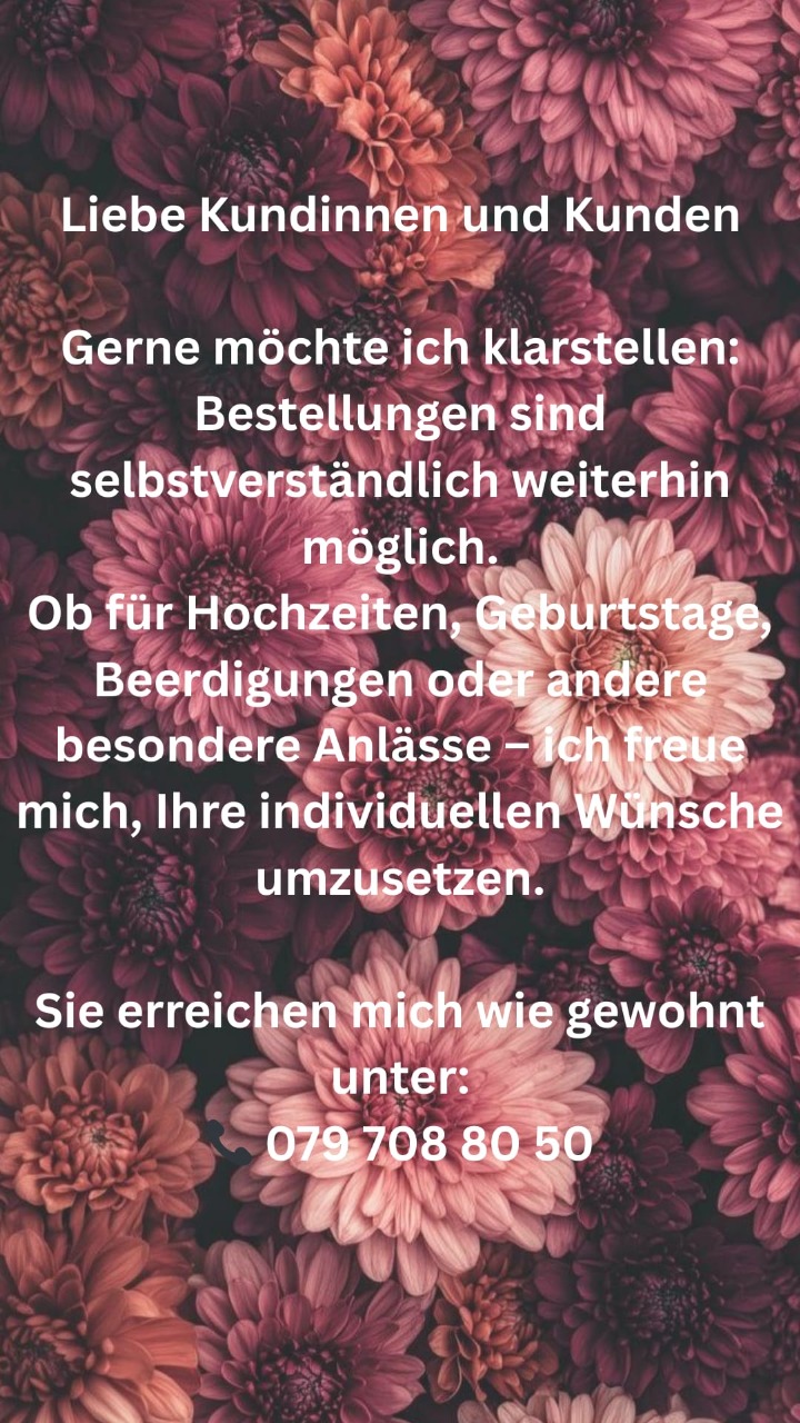 Blumen sind ausgezeichnete kleine Geschenke und bereiten jeden Tag Freude. Wenn Sie Ihre Nächsten mit einem Strauss, einem Gesteck oder einer speziellen Kreation eine Freude bereiten möchten, besuchen Sie unseren Laden oder den Agrola TopShop in Düdingen. Da die Zufrieden-heit unserer Kunden für uns an erster Stelle steht, ist unser Angebot speziell auf Ihre Wünsche zugeschnitten. Wir legen Wert auf erstklassige Qualität!